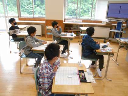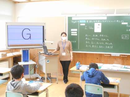 5年生は、外国語科の時間にアルファベットの書き取り練習に取り組みました。正しい書き順をデジタル教材で確かめながら、気を付けてかいていました。