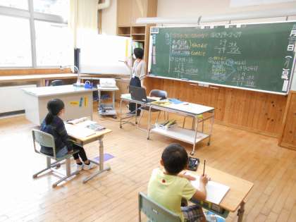 2年生は算数科で、問題できかれていることを図に表して、ある部分を求めるときは、どのような式をつくるとよいかについて考えました。全体と部分の関係を捉えて立式する力を高めています。