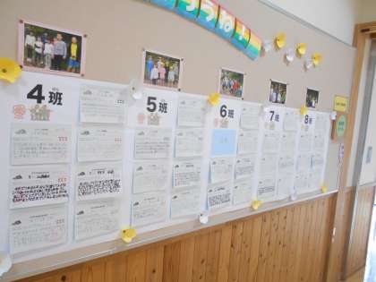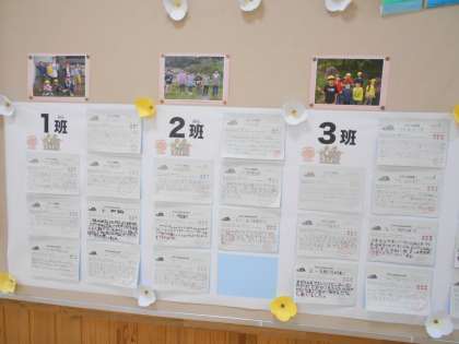 多目的ホールの掲示板には、スマイル班遠足の振り返りカードが掲示されています。楽しい思い出になったことや、友達となかよくなったこと、リーダーとして班をまとめられたことなど、心に残ったことが書かれていました。