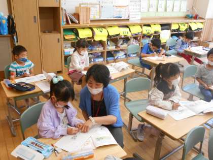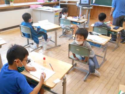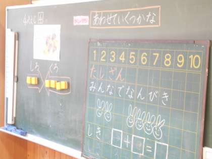 1年生は、算数科できのうに引き続き、たし算の学習に取り組みました。はじめにいた鳥の数と後からきた鳥の数を合わせて、みんなでいくつになるかを考えました。
