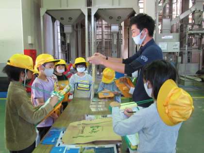 総合的な学習で、半日をかけて山田地域を巡ってきました。はじめに、下中瀬のカントリーエレベーターを訪れました。育苗のこと、稲刈りをしてから乾燥させ、冷蔵しながら保存することなどを教えていただきました。設備一つ一つの大きさに驚きながらも、ここから全国各地に、山田産の美味しいお米が出荷されていることが分かりました。