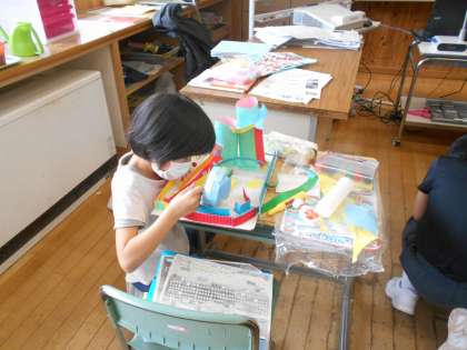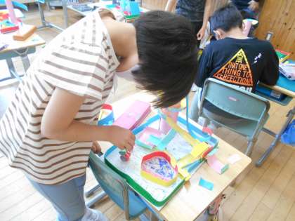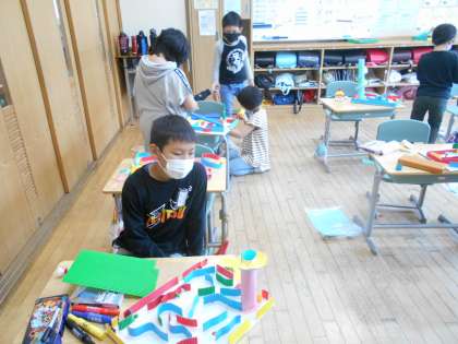 4年生は、ビー玉を転がしながら仕掛けを工夫して工作をしています。何度もビー玉を転がして試行錯誤しながら制作しています。