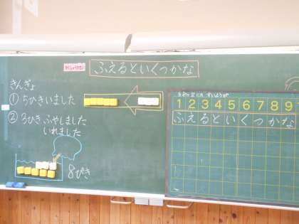今日は「ふえると いくつか」という学習課題で考えました。