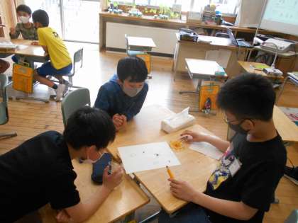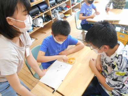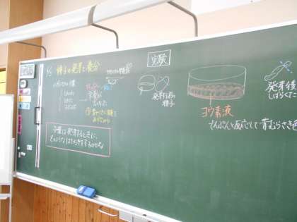 5年生は理科の学習で、子葉の栄養分について調べました。ヨウ素液に子葉を浸して反応を確かめました。