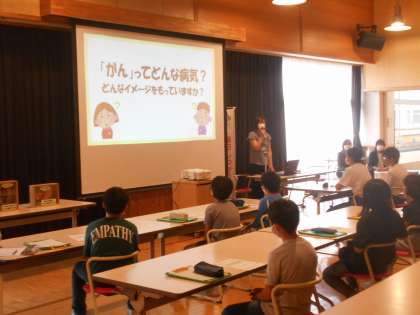 6年生は中学2年生と共に「がん健康教室」を受講しました。がんは早期発見することで進行を防ぐことができます。健康診断を適切に行い、自分の健康を自分で守ることや、家族の健康を気遣うことなどを学びました。