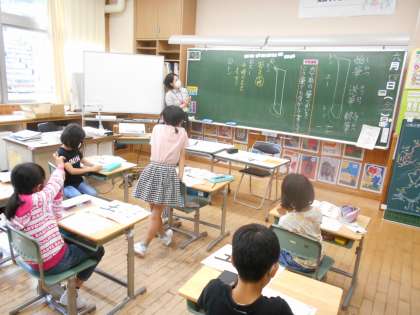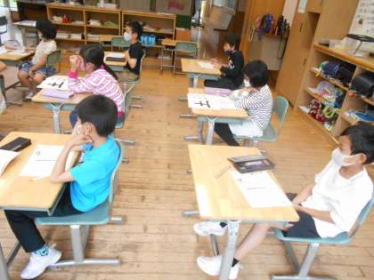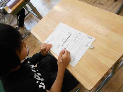 3年生は、書写(硬筆)の時間に「縦画」の鉛筆の動かし方を学びました。鉛筆を「スー」と動かすところや、「トン」と止めるところなど、力のいれ具合も考えながら書きました。