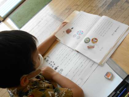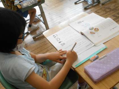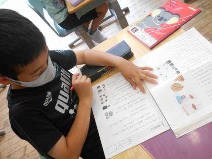 3年生は国語科で「こま」についての説明文の学習をしています。今日は、各段落に書いていることを大まかに捉えるために、ワークシートにキーワードを書き込みました。