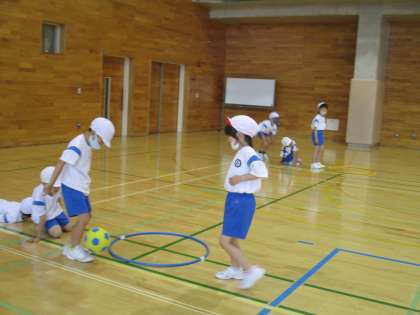 1・2年生合同のチームで、ボール蹴りリレー競争をしました。
