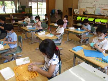 四角や丸、三角に形を変える練習をした後、動物や食べ物など、それぞれが作りたい物を表現しました。
