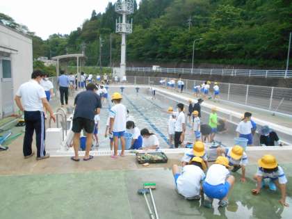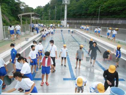 3〜6年生と中学生がプール掃除を行いました。12日(土)に保護者の皆さんの掃除に引き続き、プールサイドやプール本体の仕上げをしました。