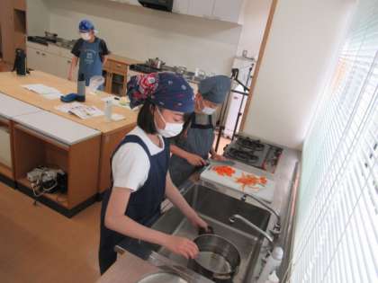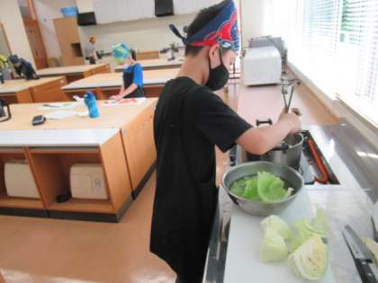 家庭科の調理実習で「ゆで野菜サラダ」をつくりました。野菜の切り方やゆで時間に気を付けながら、グループのみんなで協力して活動することができました。