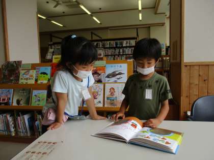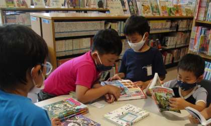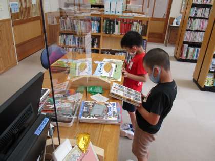 3〜6年生がプール清掃に行っている間、1、2年生は図書館を利用しました。