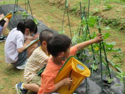 畑に行って、野菜のお世話をしました。キュウリもだんだんと大きくなってきました。