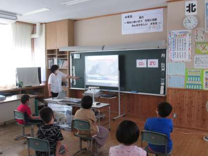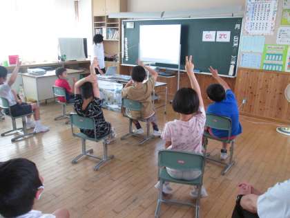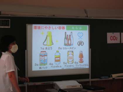 子供たちは、二酸化炭素の排出量が、地球温暖化にとても影響があり、現状が変わらないと大変なことになることを映像や資料から学びました。クイズを解きながら楽しく環境について考えました。