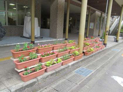 スマイル班やボランティアで植えた花のプランターが、フラワーロードと正面玄関に並びました。昨日の委員会活動で、委員の子供たちが、重たいプランターを運んできれいに並べました。今週は、3・4年生が、水やり担当です。全校のみんなでお世話して、美しい夏花でいっぱいになるのが楽しみです。