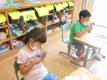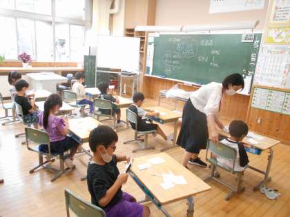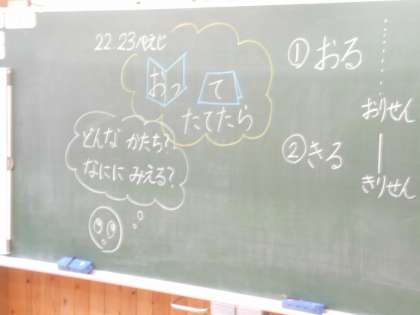 1年生は図工科の学習で、「紙を折って立てたら何に見えるかな」という課題で活動しました。子供たちは思い思いに形を見立てながら楽しんでいました。