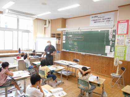 3年生は大きなものの長さを測る学習をしています。1mものさしや巻き尺を使い調べています。