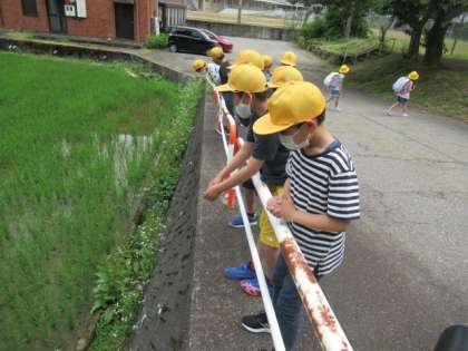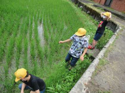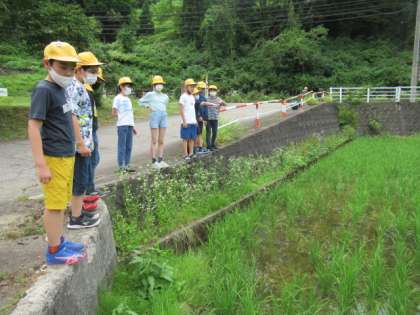 5月の田植えから1ヶ月半ほど経ち、田んぼの様子を見に行きました。苗は葉の数が増え、背丈が伸びていました。