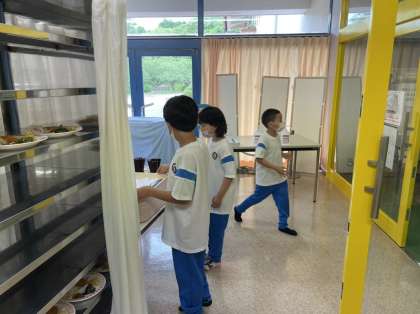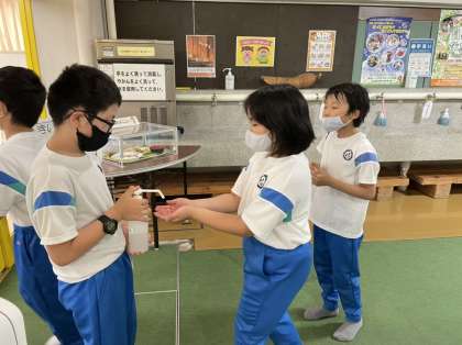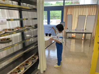 食事係が準備をしています。 食事前の手洗い、消毒もバッチリです。