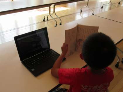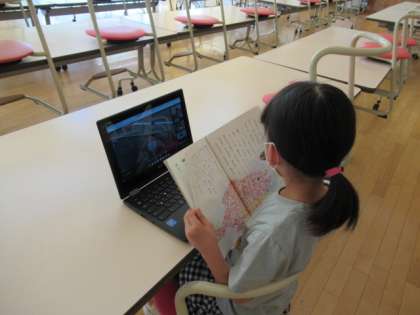 担任の先生と離れて、ランチルームで端末の画面を見ながら、学習しました。発表したいとき、指名されたときなどに、どのような操作をしたらよいのかが分かりました。