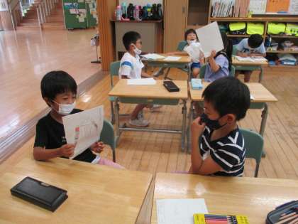 ぬいぐるみ、飼っている生き物、おもちゃ等、一人一人が自分の好きなものを絵カードに書き、友達に紹介しました。