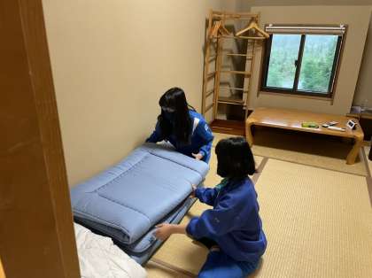 部屋ごとにシーツをたたみ、朝の支度をしています。
