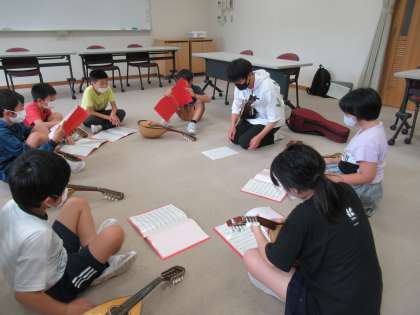 富山大学マンドリン部の学生さんに教えていただきながら、パートごとに練習をしました。難易度が高い楽曲ですが、少しずつ弾ける箇所が多くなってきています。