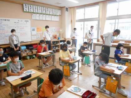 富山市教育委員会の6名の方が、学校視察に訪れました。子供たちは参観者がいる中でもいつも通りの様子で学習に取り組んでいました。