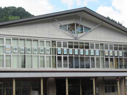 卒業生の中山楓奈さんの銅メダル獲得をお祝いして、校舎にメッセージを掲げました。