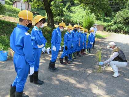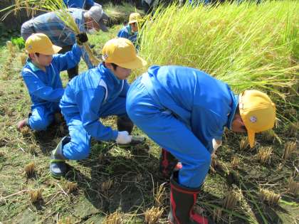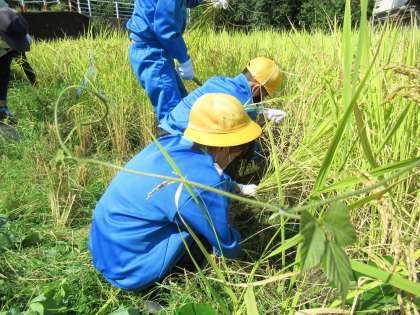 田植えの後、地域の方にしっかり管理していただいた稲が、見事な黄金色に実っていました。鎌の使い方を教えていただき、みんなで協力して、手際よく作業を進めました。