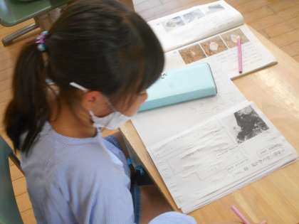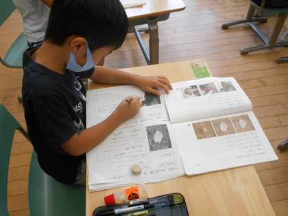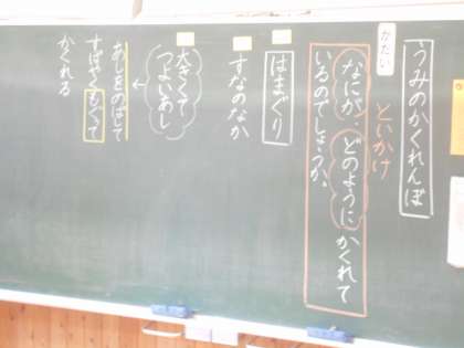 1年生は先週に引き続き「海のかくれんぼ」の教材文を読み、何がどのように隠れているかを読み取りました。分かったことをワークシートにまとめました。