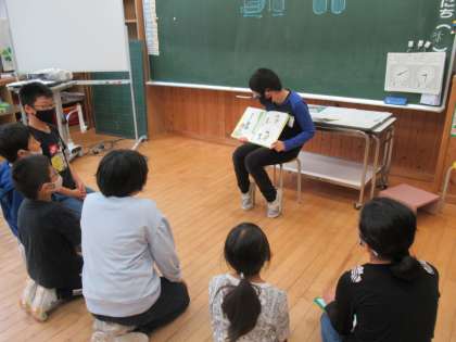 今週の担当は、5年生、4年生でした。擬音語や擬態語がおもしろい絵本や楽しい様子の挿絵の絵本など、思い思いの本が読まれました。