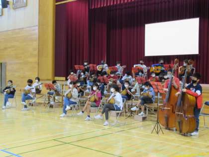 発表会本番の配置で、マンドリン練習を行いました。大学生さんにアドバイスをもらって、上達を目指しています。今日は、練習後、調弦もしていただきました。美しくなった音色で明日からの練習も頑張ります。