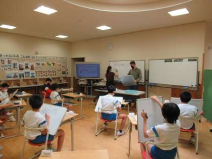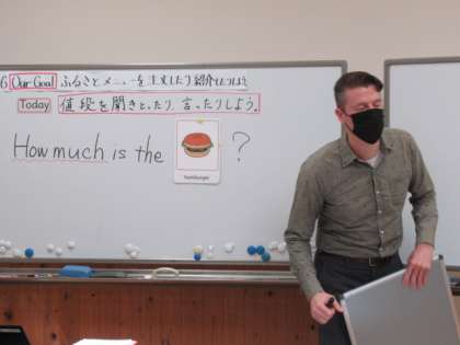 外国語科で、金額の伝え方を学習しました。聞き取った数字をボードに書き、クイズのように楽しみながら学びました。