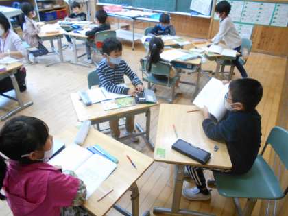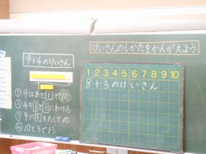 1年は算数科でくり上がりのたし算を学習しています。グループの友達に自分の求め方を説明しました。