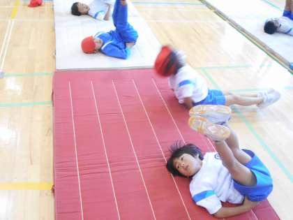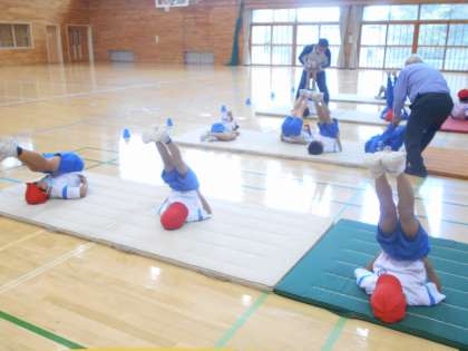 マットで足を高く上げて体を支える運動に取り組みました。バランスを取りながら長い時間支えている様子が見られました。