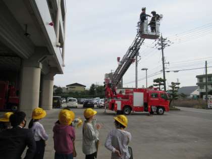 富山消防署では、車両や装備、はしご車の訓練を見学して、火事からくらしを守る人々の活動を学びました。