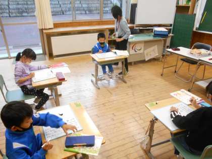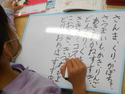 2年生は、国語科で「秋らしい言葉」を集めて紹介する学習に取り組みました。子供たちは、教科書の挿絵も手がかりにしながら言葉のイメージを広げていました。