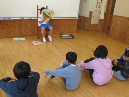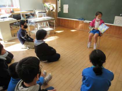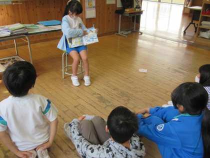 今週は、1年生が絵本や紙芝居を読みました。1年生は、みんなに楽しんでもらえるようにと練習してきました。