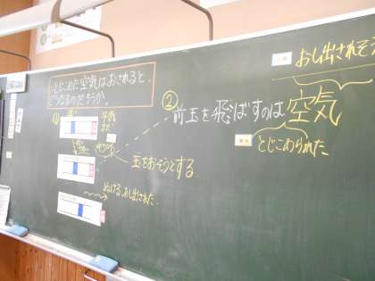 4年生は理科で、「とじこめた空気と水」の学習に取り組みました。空気鉄砲を利用して「閉じ込めた空気がもとの体積に戻ろうとする」性質について考えました。