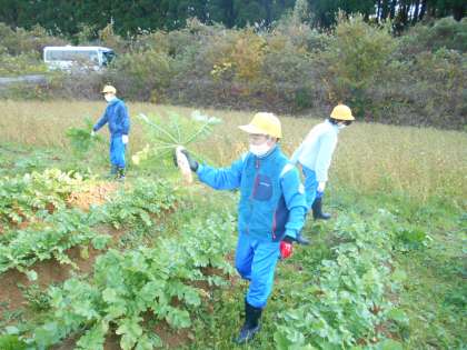 5年生は、清水の谷上さんの指導の下、大根の収穫体験を行いました。9月に種を蒔いた大根が立派に育ちました。5年生は、谷上さんに大根の生長の様子を教えていただき、新しい知識を得ていました。