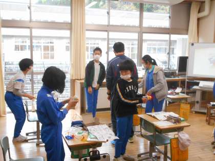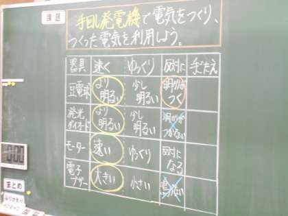 6年生は理科で、手回し発電機を使って電気をつくり、その働き方を調べました。使われる電気の消費量によって、発電機の手応えが違うことを実感していました。