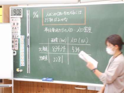 5年生は算数科で、単位量あたり数量について学習しています。今日は、人口密度を取り上げて学びました。