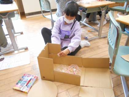 1年生は生活科で、手作りおもちゃを使って「秋のわくわくランドを楽しもう」という目当てを立てて、その準備に取り組んでいます。