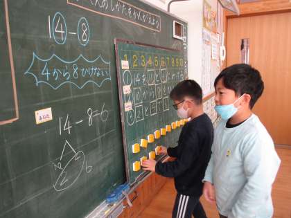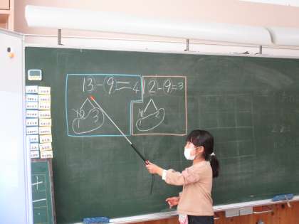 13−9、14−8などの計算について、ひかれる数を「10といくつ」に分けた後、「10からひく」という計算方法を、図や言葉、ブロック操作を通して考えました。