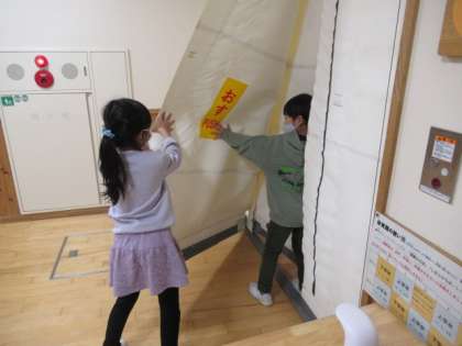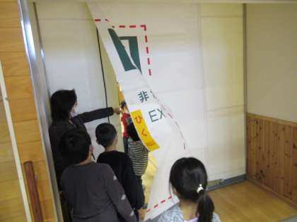 今月の避難訓練は、防火扉のくぐり方を体験することです。一人一人、気を付けながら通過の仕方を覚えました。