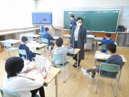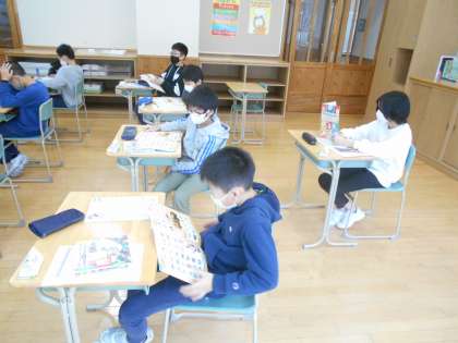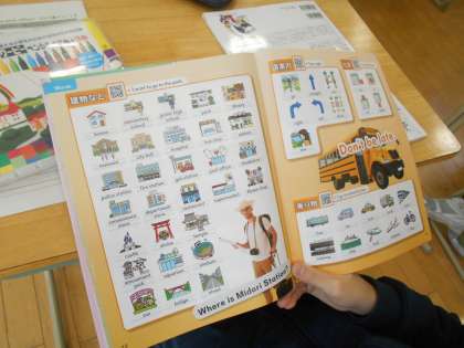 5年生は、外国語科の学習で「マイタウンをつくろう」をテーマにして学びました。さまざまな場所や施設の言葉の言い方を学びました。