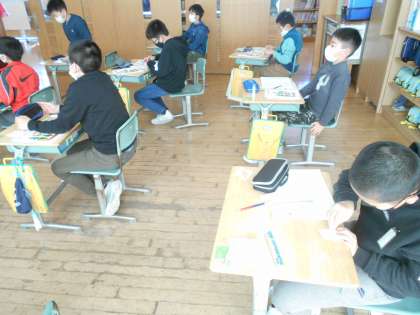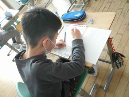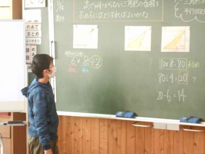 5年生は算数科で四角形の面積を求める学習に取り組んでいます。今日は、平行四辺形を長方形に等積変形をすることで、その面積を考えました。