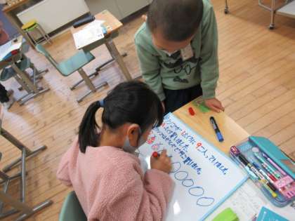 スーパー、学校、家等でかけ算の式に表すことができる場面を考えて問題作りをしました。文章、絵、式、答えとペアで考えながら取り組み、その後は一人で問題を作ることができました。