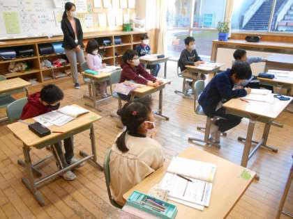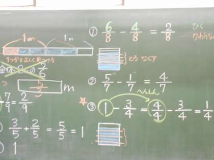 3年生は算数科で分数の学習に取り組んでいます。もとにする大きさの分数がいくつ分あるかを確かめながら考えていました。
